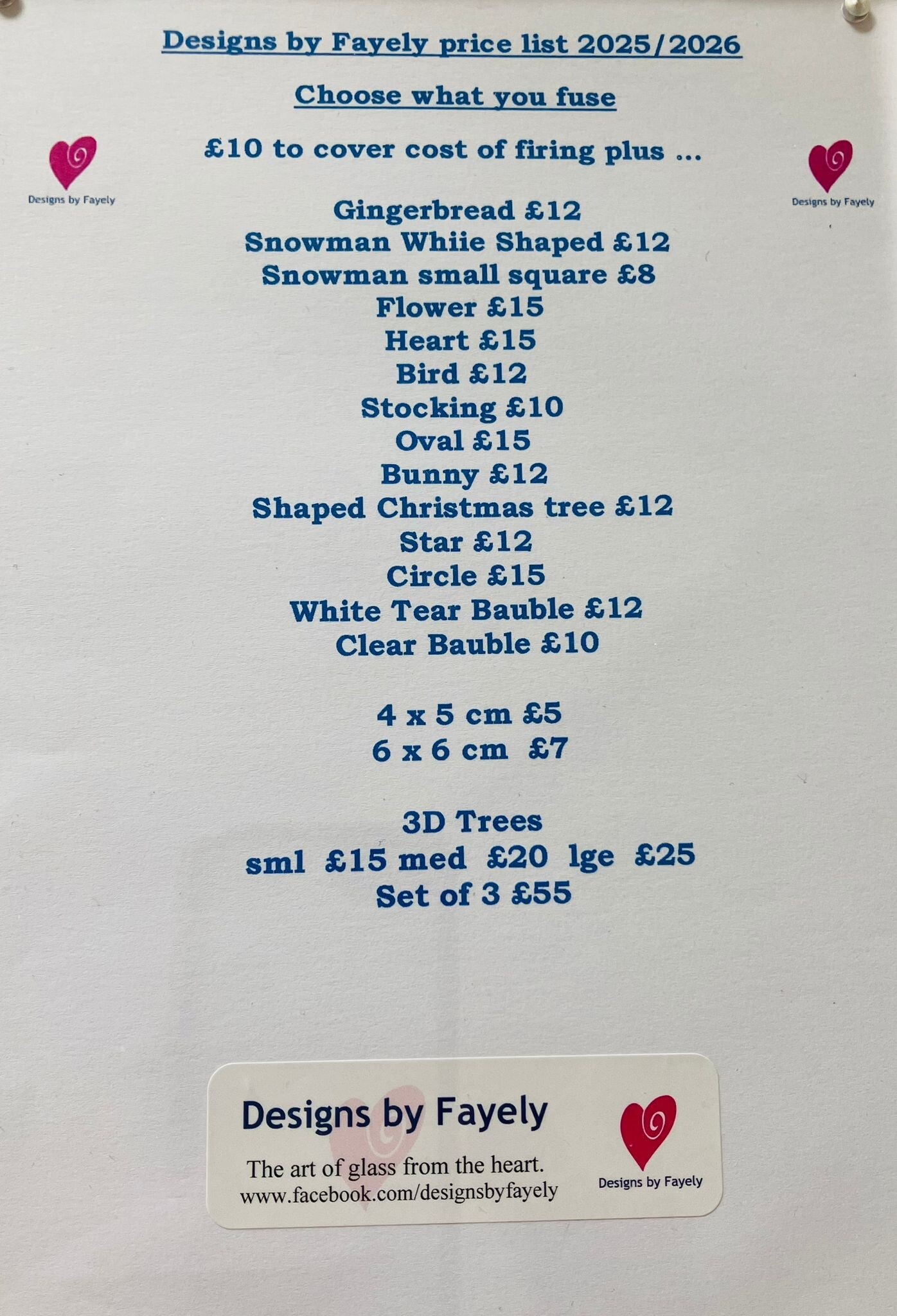 Pay £10 cover charge to reserve your space and for the tuition and firing. Then choose what you fuse.